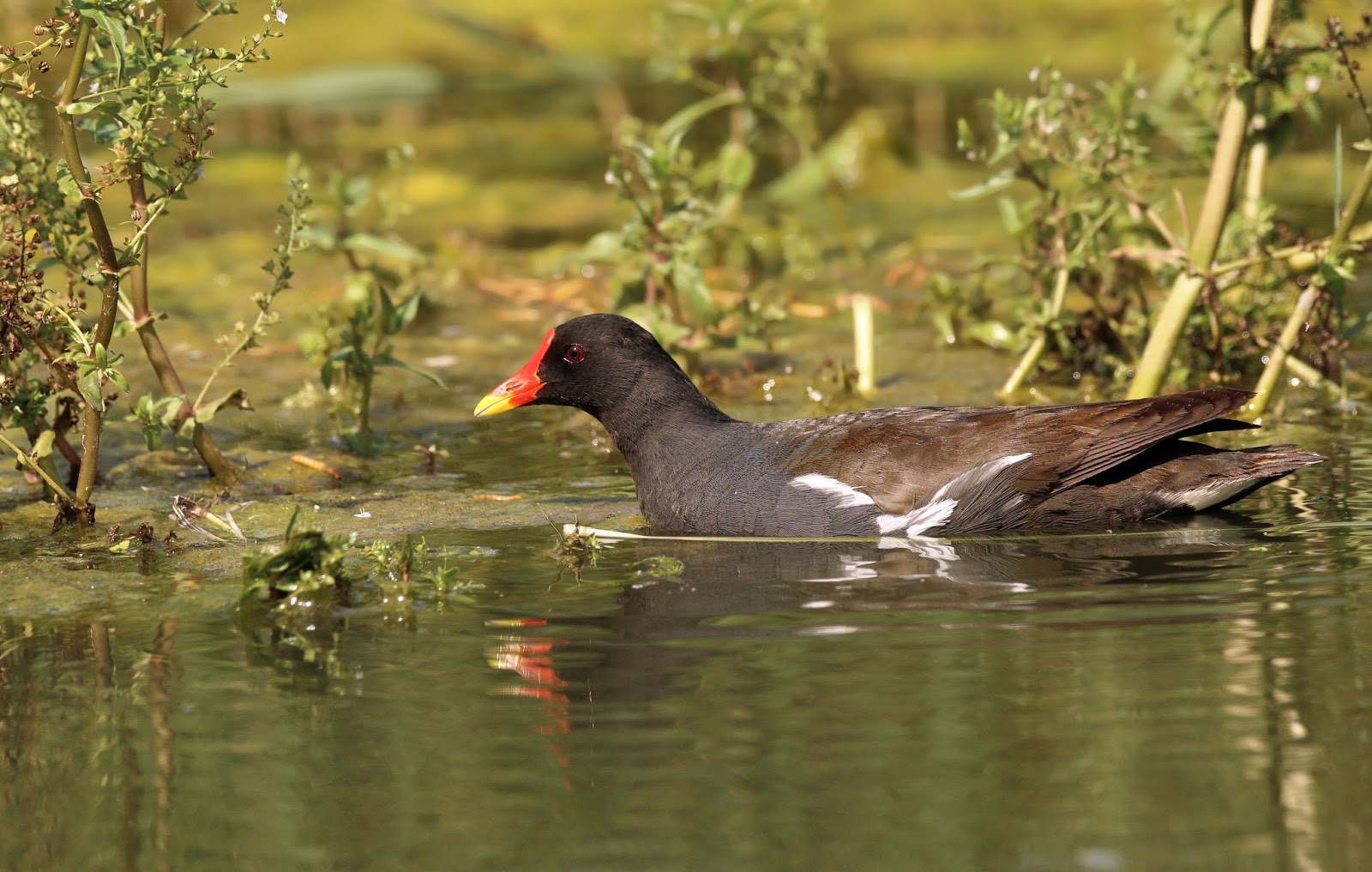 Asimismo, por lo avanzado de las fechas, muchos de los pollos que se han criado aquí, ya se pasean por la laguna haciendo vida casi independiente. Mención especial a las pollas de agua, muy abundantes y con pollos de todas las edades.